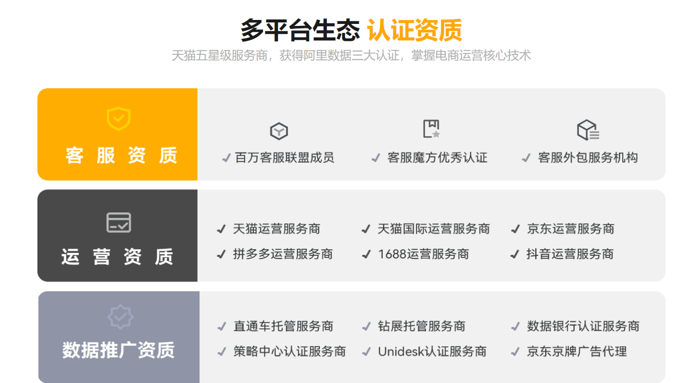 天猫五星级服务商,获得阿里数据三大认证,掌握电商运营核心技术